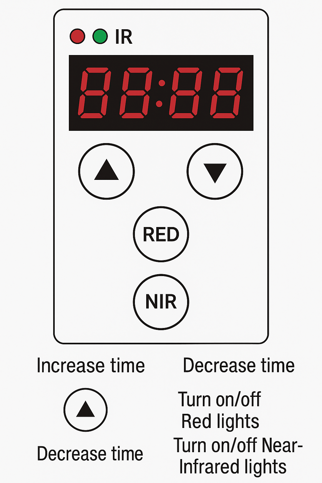 Adjustable timer (0–30 minutes) and individual red/infrared mode selection.